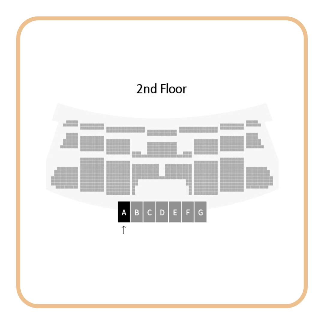 2층 A 사이트 객석입니다. 1층 보다는 무대와의 거리가 멀어진 것을 확인하실 수 있으며 2층까지는 무대에 나오는 사람들의 표정을 자세히 볼 수 있는 위치입니다.