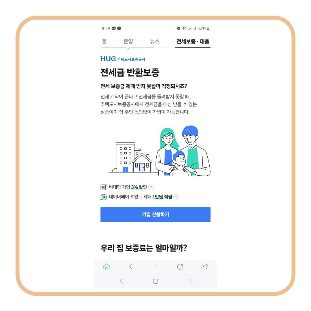 보증보험 가입기관 중 개인적으로 HUG를 권장드립니다. HUG는 네이버와 협약이 되어있어 네이버 부동산에서 간편하게 신청이 가능합니다. 홈페이지로 이동해서도 가입하실 수 있습니다.