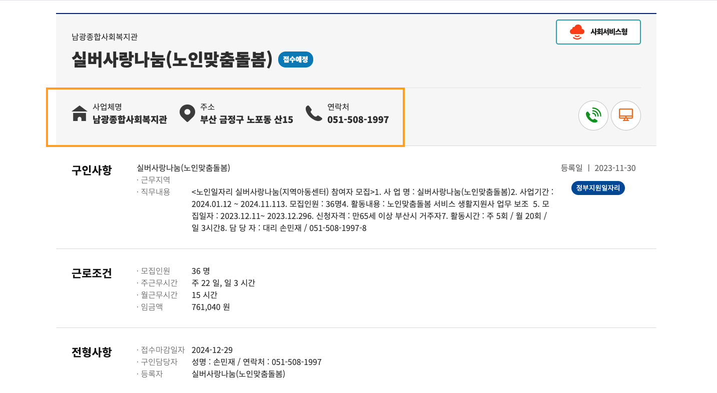 자세한 내용은 아래 구인사항과 근로조건을 통해 급여와 채용 신청자격을 확인하신 후 조건에 맞고 원하는 일자리를 찾았다면 지원을 해주시면 됩니다. 채용에 대한 기타 궁금한 사항 함께 표기되어 있는 연락처를 통해 문의해주시기 바랍니다.