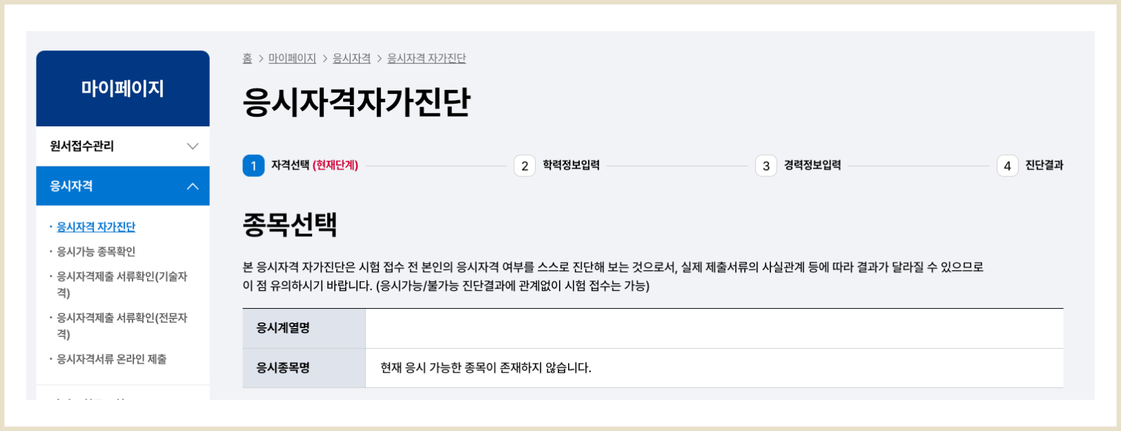 더 구체적인 사항은 아래와 같이 큐넷에서 응시 자격 자가진단을 통해 확인하실 수 있습니다.