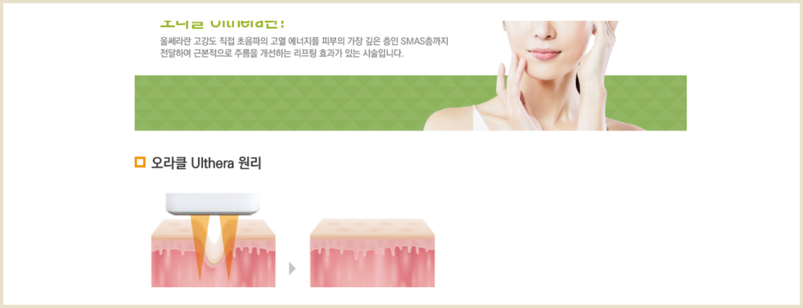울쎄라 시술은 주로 30대 후반에서 40대이신 분들이 많이 선택하는 방법으로 피부의 처짐이 심하게 나타나기 시작하는 연령부터 적절한 치료 방법입니다.