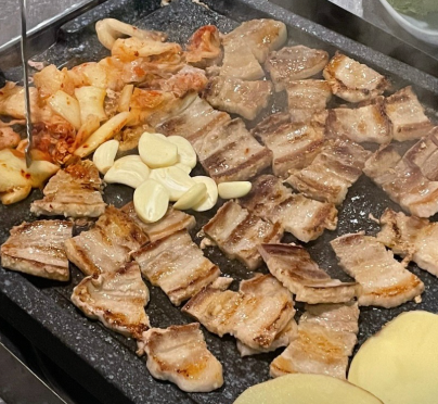 철판에 구워먹는 삼겹살 파절임에 김치, 감자도 함께 구워 먹고 마지막은 철판 볶음밥까지 완벽한 식사를 할 수 있습니다.
